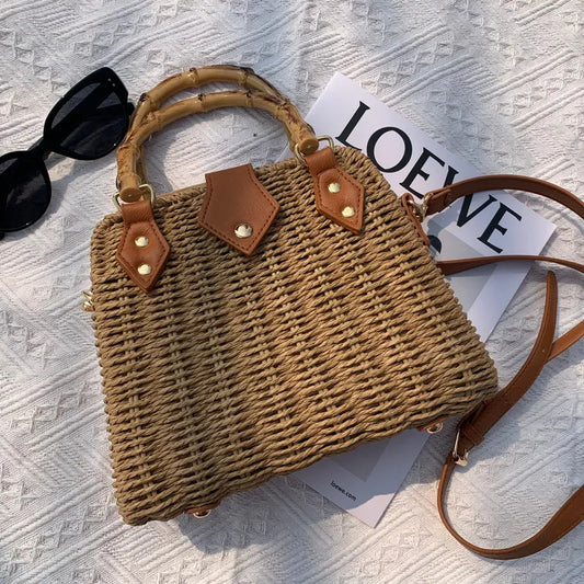 LINA | Gevlochten Dames Handtas Met Bamboe Handvatten En Cognackleurige Details