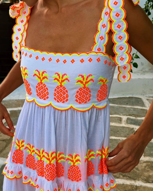OLIVIA | Witte Zomerjurk met Ananasborduursel – Speels, Zomers en Opvallend