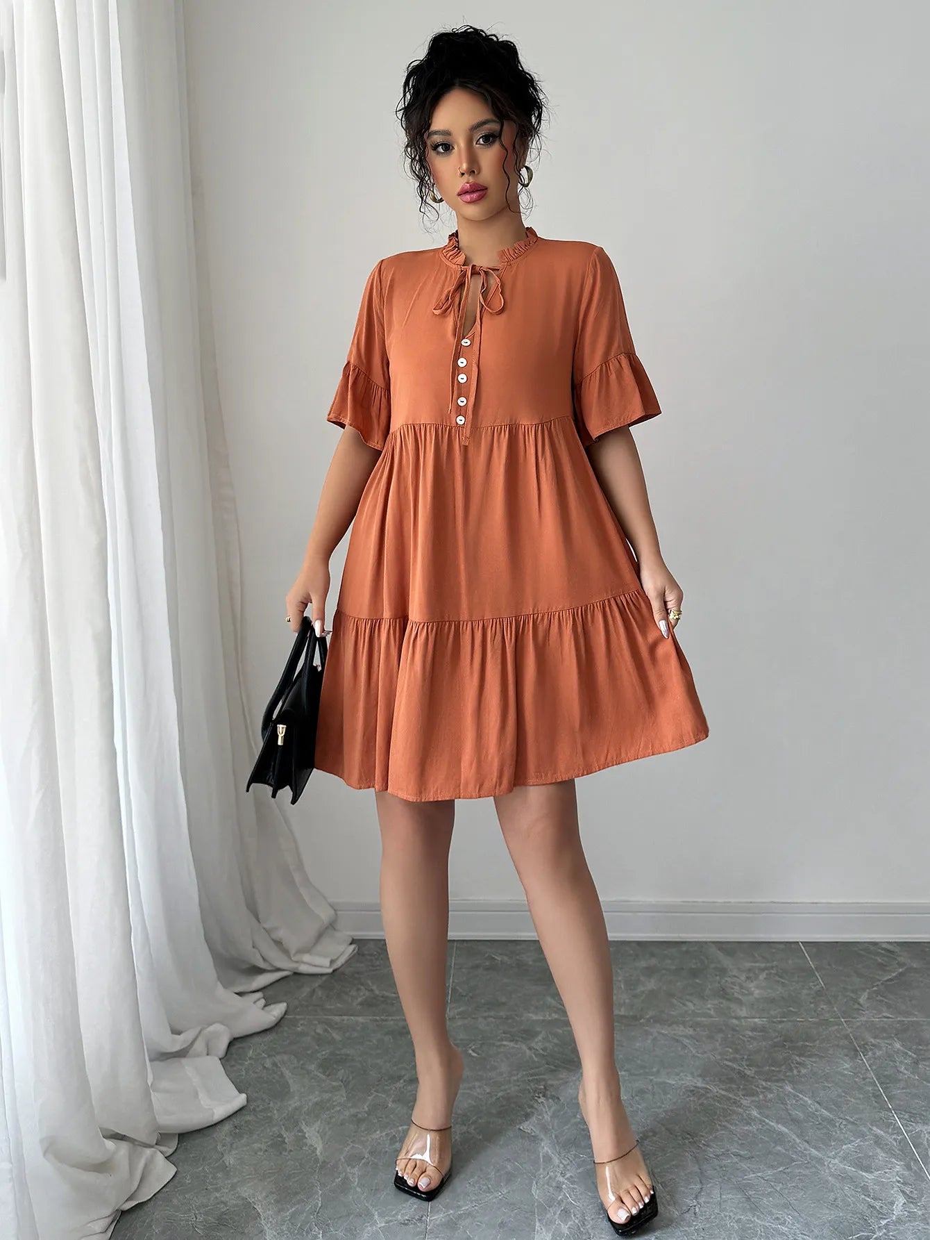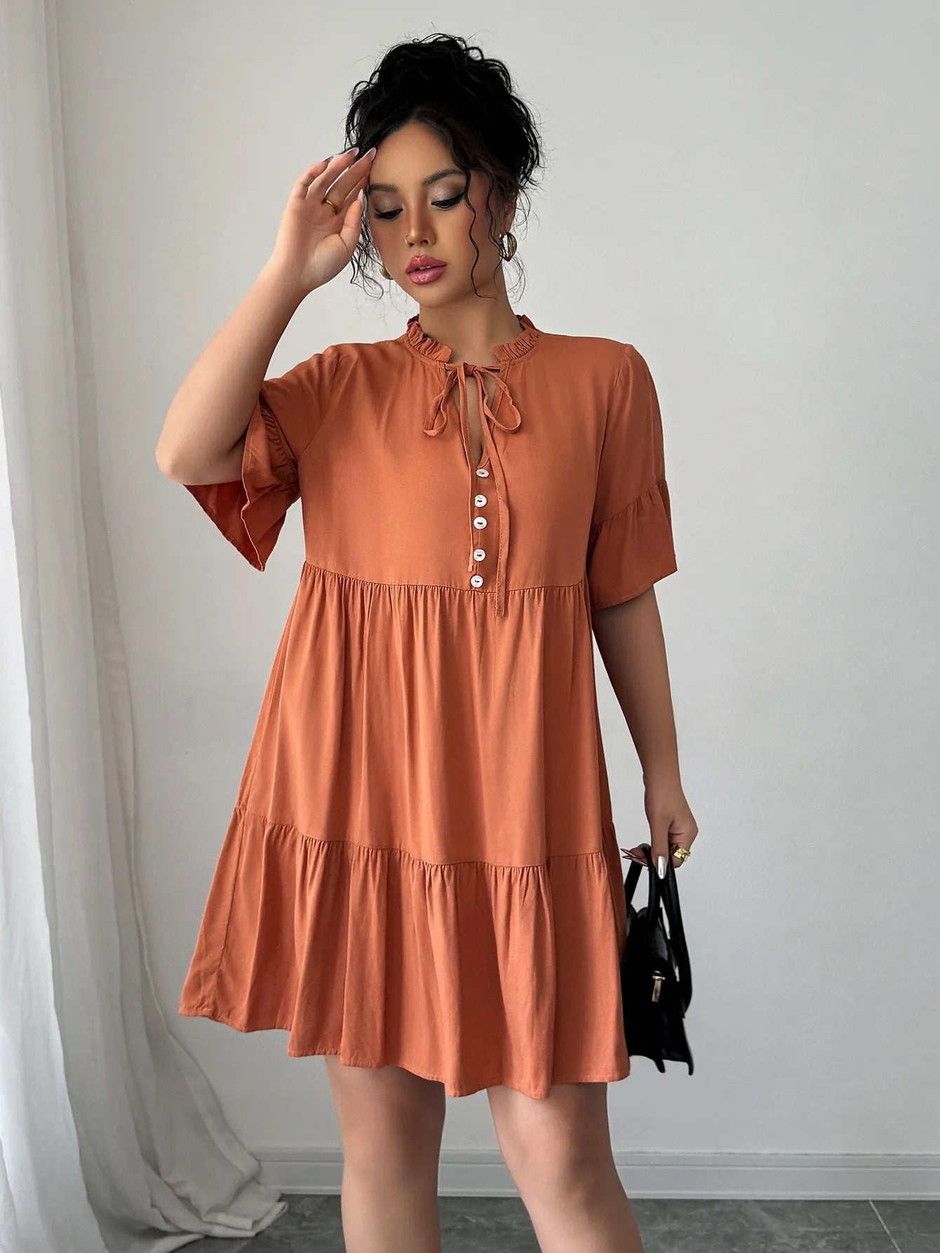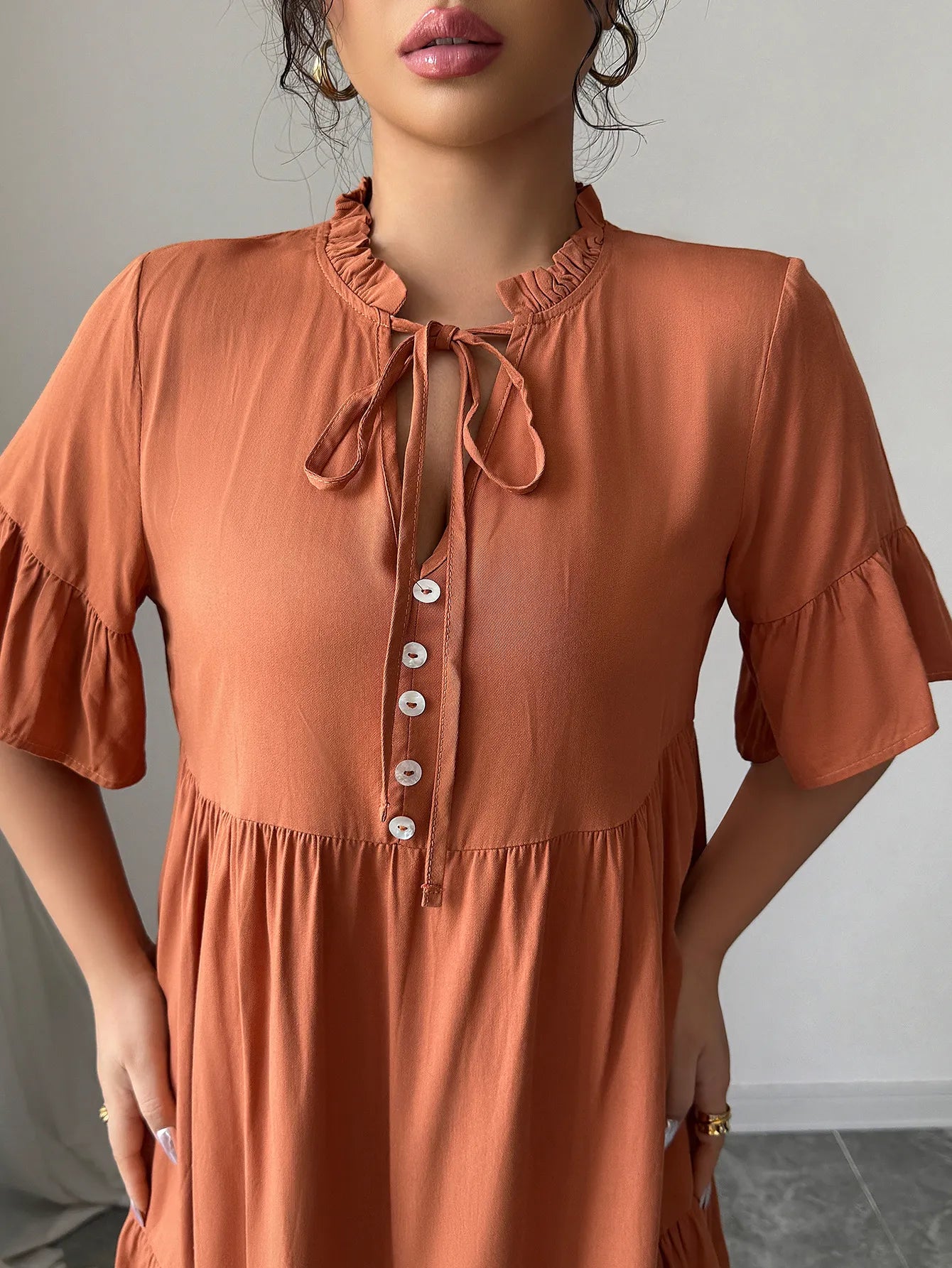 Ruches met strikdetail aan de halslijn zorgen voor een vrouwelijke, verfijnde look