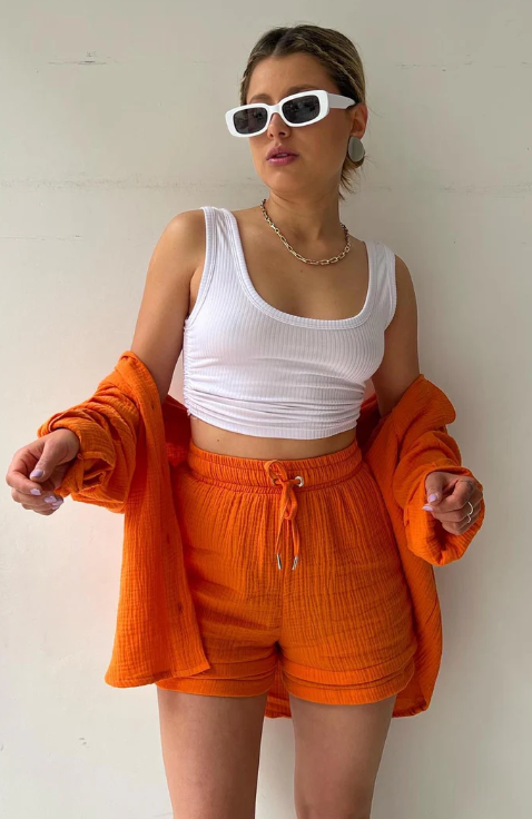 Deze luchtige outfit bestaat uit een stijlvolle blouse met knoopsluiting en bijpassende shorts – dé perfecte combinatie voor warme dagen, city strolls en casual momenten met een fashionable twist.